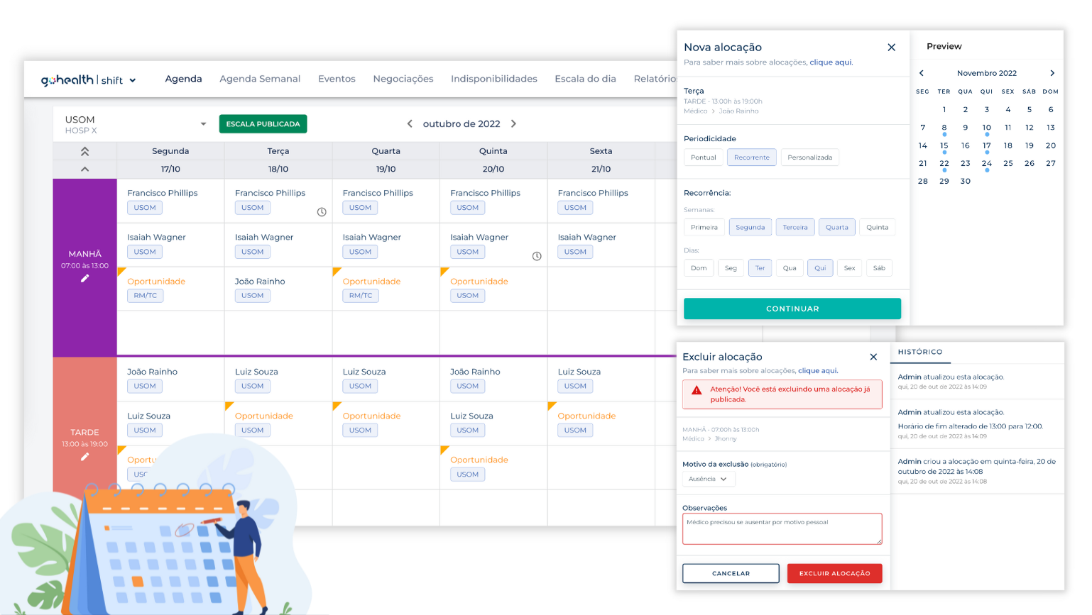Em poucos segundos, tenha uma visão completa das suas alocações, profissionais cadastrados, carga horária, solicitações, alterações na agenda, dentre outros.